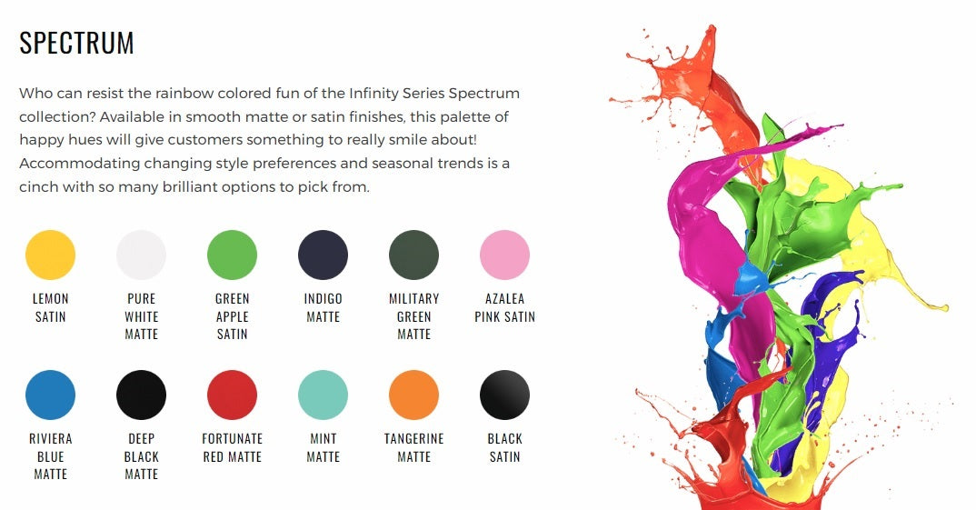 Who can resist the rainbow-colored fun of the Infinity Series Spectrum collection? Available in smooth matte or satin finishes, this palette of happy hues will give customers something to really smile about! Accommodating changing style preferences and seasonal trends is a cinch with so many brilliant options to pick from.